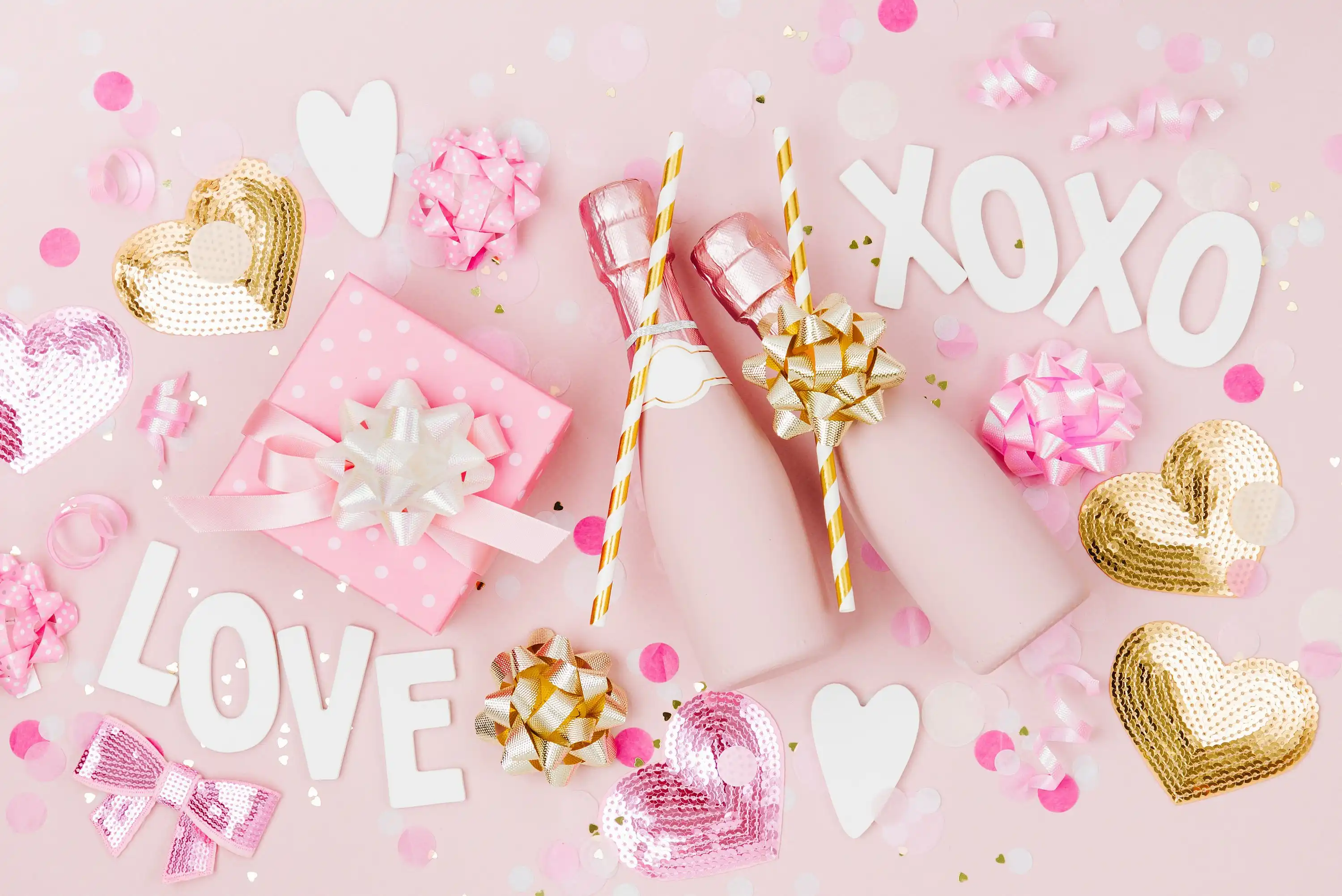 Flat lay of two pink champagne bottles with gold bows, pink gift box, white LOVE and XOXO letters, heart-shaped decorations, and confetti on a pastel pink background.